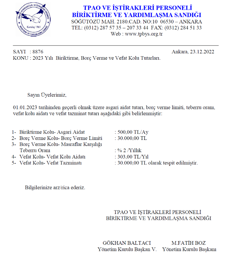 TPAO Biriktirme ve Yardımlaşma Sandığı - 2023 Yılı Biriktirme, Borç Verme ve Vefat Kolu Tutarları Duyurusu