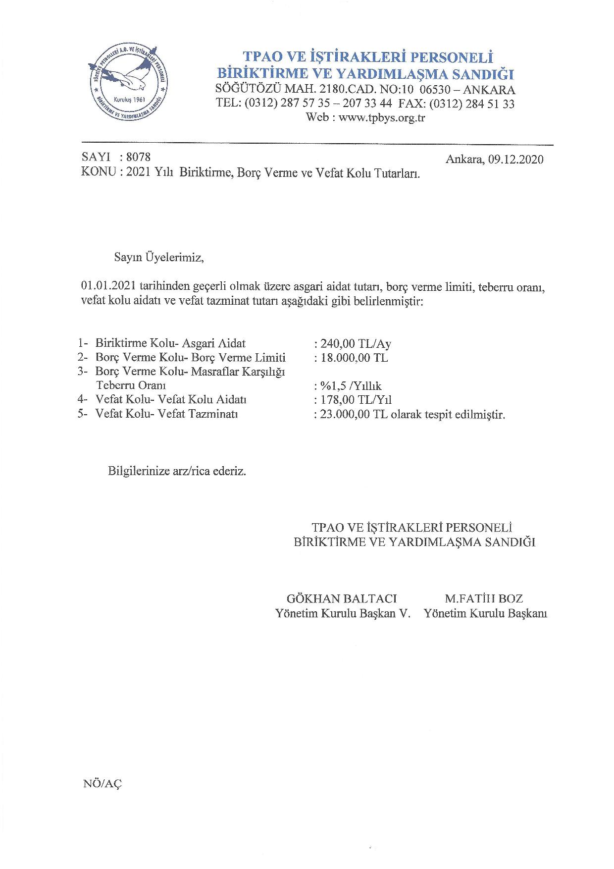 2021 Yılı Biriktirme, Borç Verme ve Ölüm Kolu Tutarları