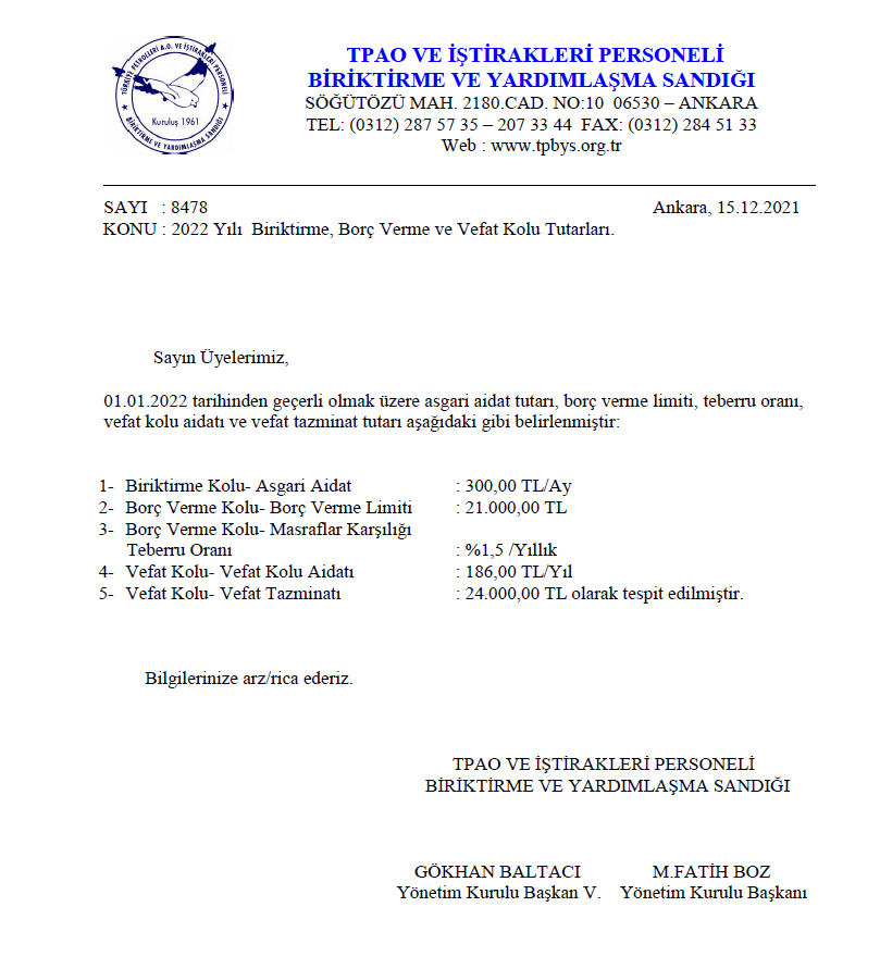 TPAO Biriktirme ve Yardımlaşma Sandığı - 2022 Yılı Biriktirme, Borç Verme ve Vefat Kolu Tutarları Duyurusu